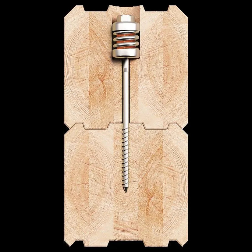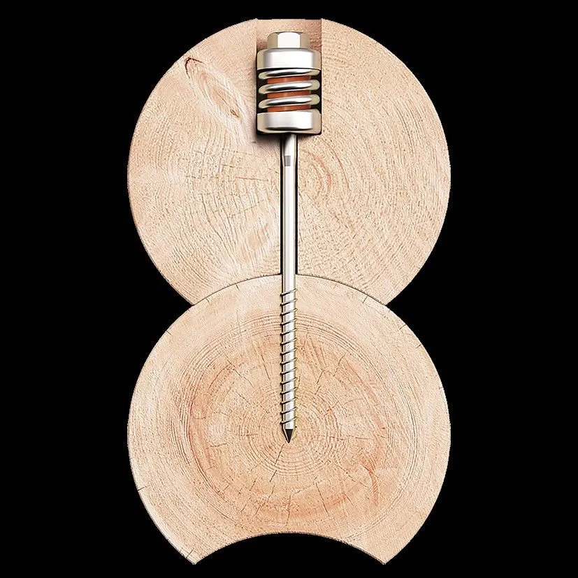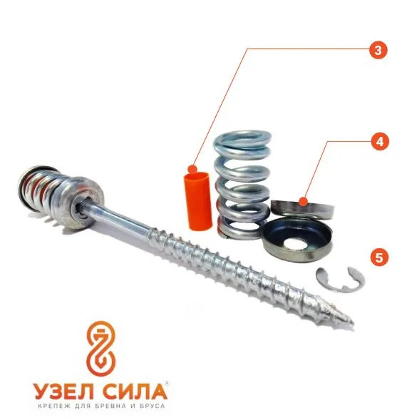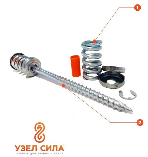 Пружинный крепеж "УЗЕЛ СИЛА" максимально плотно прижимает бревна, профилированный брус, клееный брус или лафет друг к другу в момент монтажа, а создающая мощное напряжение пружина предупреждает появление межвенцовых зазоров.